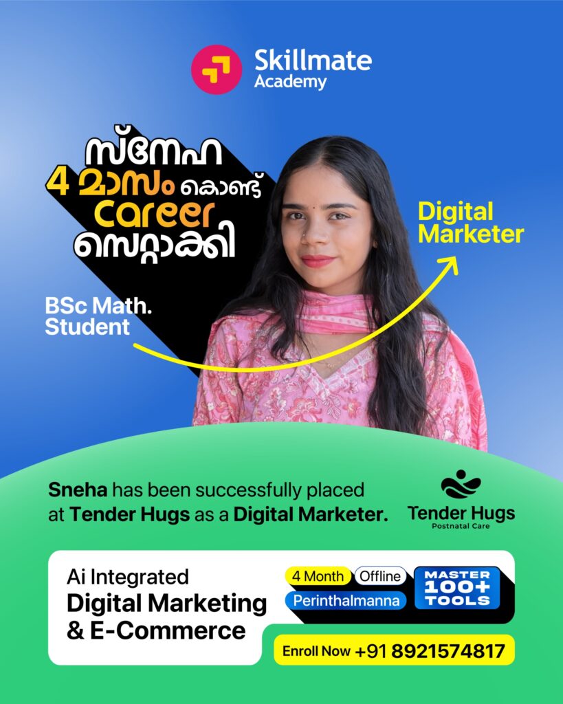 In Malappuram, Skillmate is one of the leading names and it is also considered the Best Digital Marketing Institute in malappuram by many delivering comprehensive training in Digital Marketing along with E-commerce and Graphic Design.Starting from SEO, Google Ads, Social Media Marketing, and Content Marketing, to E-commerce strategies, all the way to Graphic Design-the course covers every necessary thing to make one industry-ready. Live projects, mentorship by experts, and learning by practice make Skillmate the Best Digital Marketing Institute in Malappuram for freshers and professionals seeking career growth.